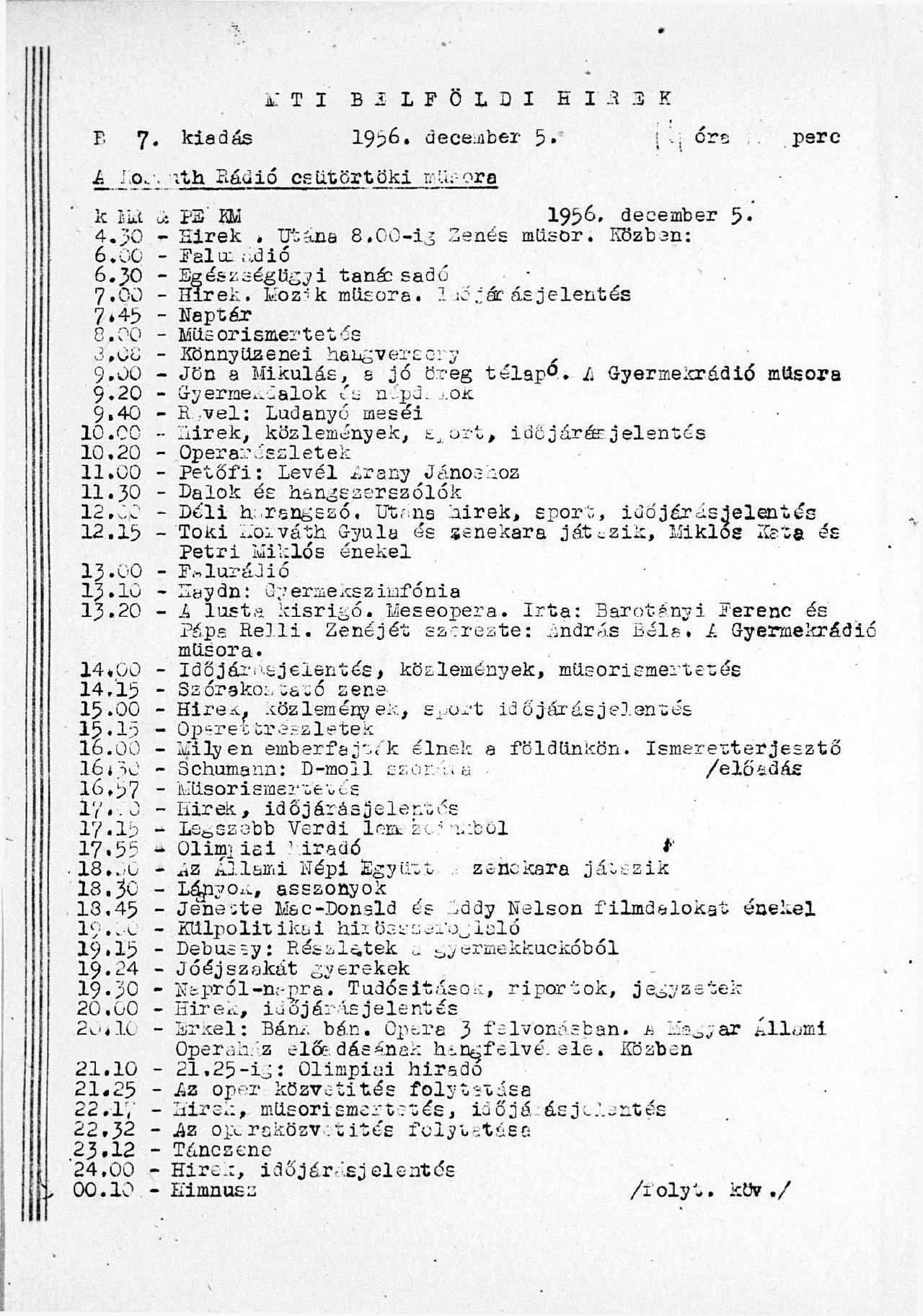 1956. december 5. K 13.20. (Ekkor Pápa Relli az Ifjúsági Osztály vezetője, amiért később eltávolítják a rádióból)