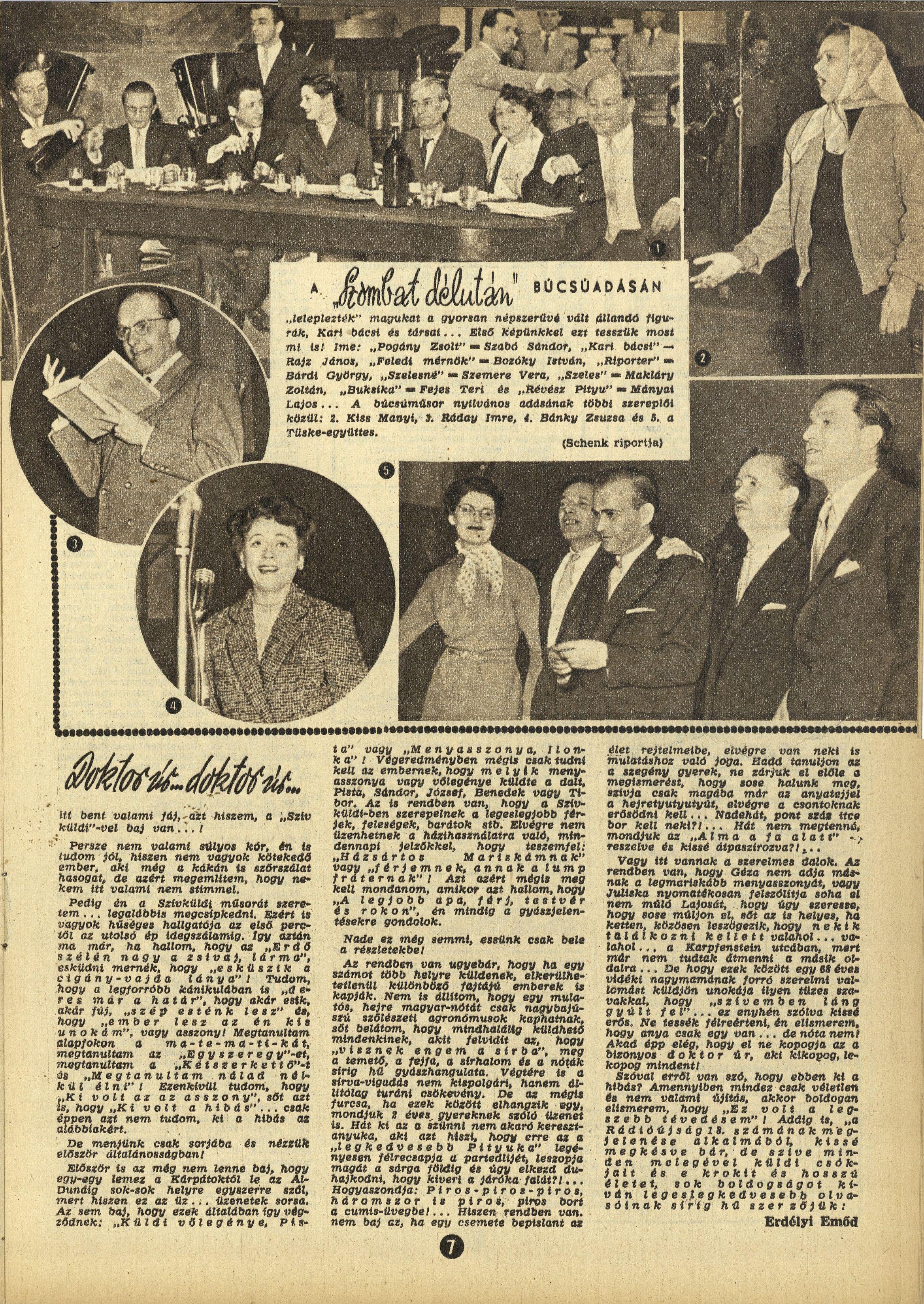 FOLYTATÁSOS JÁTÉK… — Így jelezte a „Magyar Rádió“ ez a néhány hete az új műsorszerkezetben meginduló szombat délutáni műsort. Ne vegyék olvasóink rossz néven, ha ezúttal két kiigazítást teszünk. Az egyik — ez az egyszerűbb — az adásidő korrigálása. Akkor azt ígértük, hogy szombaton 16.40 órakor kezdődik majd a műsor. És most — elnézésüket kérve — ezúton is közöljük minden érdeklődővel, a műsort 18 órás kezdettel sugározzuk a Kossuth-rádió hullámhosszán. S ha most valaki elővenné a rádióműsort és ebben az időben keresné a „Folyatásos játék“-ot, hát itt sem találná. Ez a másik, a kicsit bonyolultabb kiigazítani való. A műsor címe ugyanis a bejelentés óta „Szombat délután…“-ra változott. Jó, rendben van, megváltoztatták a címet, de miért nem írják oda alcímnek: „Folyatásos játék“ — mondhatná valaki. Különösen ha egyszer így harangozták be. Íme, itt van a címkérdés bonyolult oldala. Műsorunk ui. nem rádiójáték — legalábbis nem a szó „klasszikus“ értelmében. Sőt, nem is játék. Aki hallotta az első adást, az igazolhatja ezt. Mert miről is van szó? Adva van hat ember. Hat teljesen különböző ember, akiknek mégis van egy közös vonásuk. Ez pedig: valamennyien szeretnek kártyázni. Erre a közös szenvedélyükre — ahogy ők mondják — a SZOT jóvoltából jöttek rá. Ugyanis ezen a nyáron két hétig egy balatoni üdülőben voltak az eső miatt összezárva. Első alkalommal csak az időt akarták elverni, aztán úgy összemelegedtek, hogy azóta is együtt töltenek egy-két órát szombat délután és játsszák véget nem érő „bulijaikat“. Riporterünk elviszi mindenüvé a mikrofont, Önök pedig hallhatják majd: mi is foglalkoztatja mostanában a Szeles-házaspárt, Révészéket, az öreg Kári bácsit és az agglegény Feledit. Tehát ne felejtsék el: „Szombat délután“ 18 órakor a Kossuth-rádión találkozunk. És ott majd elbeszélgetünk. Mert ugye Önök is ott lesznek?! Fellegi Tamás